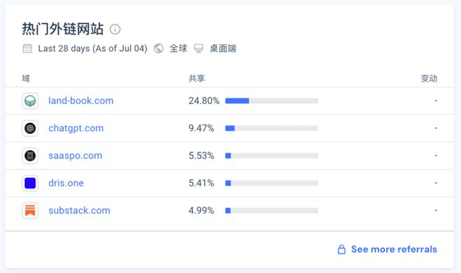 近28天的入站流量里(指流量来源网站),排名最高的是 land-book,这是一个分享高质量网页设计的网站。好吧, Cluely 的官网设计确实比较简约,但比它好看的似乎也不少?