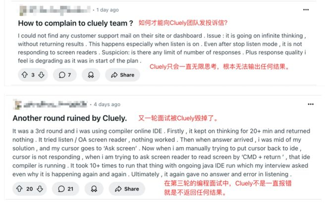 几个月前,外媒记者真实体验后,认为这款产品并不能真正帮助解决问题。最近,外网上的真实用户还在频繁曝光 Cluely 回复太“傻”、反应时间太长、引起会议音频问题、无法回复等等一系列糟糕体验。