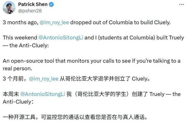 *哥伦比亚大学学生 Antonio Li 和 Patrick Shen开发了一个反 Cluely 工具 Truely,可以检测与用户通话的是否为真人