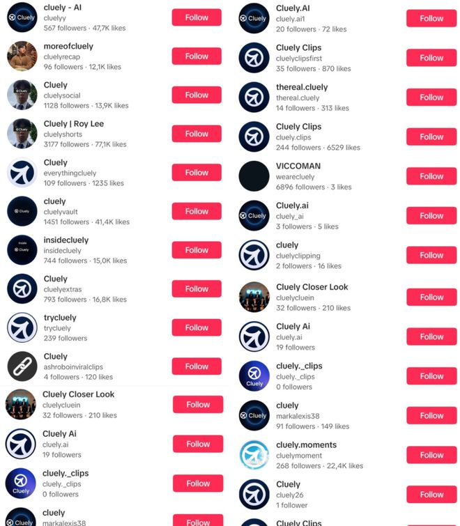据说Roy 拿了融资款后,去 TikTok 上开了1万个 Cluely 的矩阵账号,专门做短视频,搞病毒营销。结果 Twitter 上有网友扒了 Cluely 的多个 TT 账号,发现粉丝数都很低,基本都在几十粉丝到几百粉丝之间。