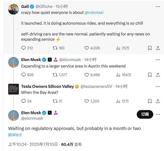 在回复一个想知道Robotaxi业务新消息的帖子时,马斯克表示,特斯拉正在扩大奥斯汀地区的Robotaxi服务范围,并回复有人问何时在湾区推行时称,正等待监管部门批准在湾区推出Robotaxi服务,可能在一两个月内推出。