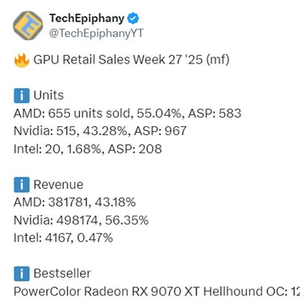 这帮助AMD在当周的整体销量上超越了NVIDIA,NVIDIA销量最高的显卡是RTX 5070 Ti和5060 Ti,分别售出120块和100块。
