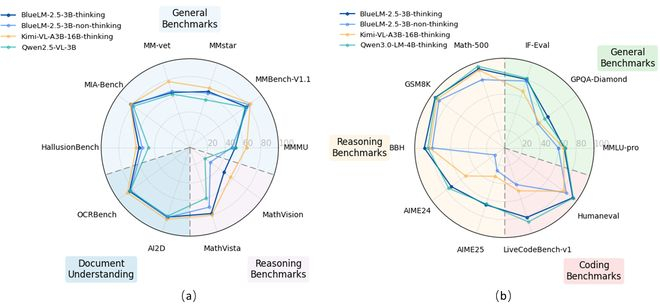 BlueLM-2.5-3B 的设计显著区别于同尺寸的其他模型。其通过精巧的结构设计与高效的训练策略,vivo AI Lab 成功地在多个评测任务中展现了该模型的领先优势。特别是在文本和多模态任务上,BlueLM-2.5-3B 的表现超越了同类模型,尤其在思考模式下,其推理能力显著优于其他同尺寸模型。