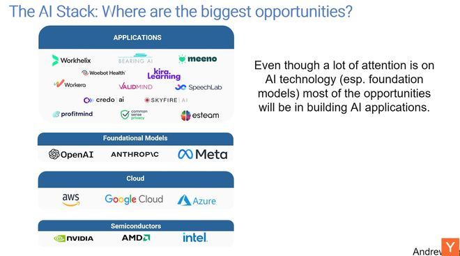 尽管大量的公关宣传和炒作都集中在这些技术层面上,但事实证明,几乎根据定义,最大的机会必须在应用层,因为我们实际上需要应用程序产生更多的收入,以便它们能够负担得起支付给基础模型、云和半导体技术层。因此,无论出于何种原因,媒体和社交媒体往往不太关注应用层。但对于那些考虑创办初创公司的人来说,几乎根据定义,最大的机会必须在那里。当然,机会存在于堆栈的各个层面上。