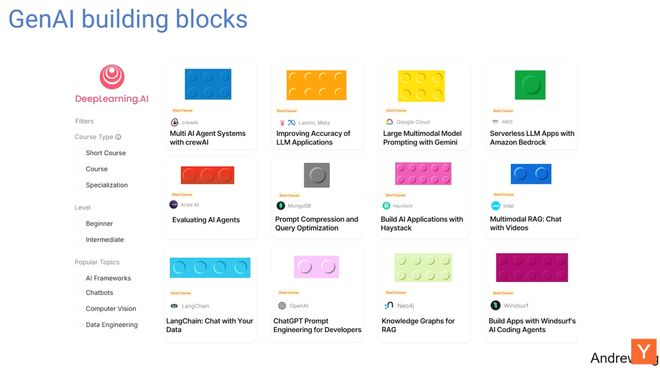 DeepLearning.ai所做的事情之一是,我自己实际上也参加了很多DeepLearning.ai的短期课程,你知道,为了与我认为世界上所有领先的AI公司合作,并尝试分发构建模块。但是当我查看DeepLearning.ai的课程目录时,这实际上就是我所看到的。每当我参加这些课程并学习这些构建模块时,我都感觉自己获得了新的东西,这些东西可以组合起来,形成组合式或指数式增长的软件应用程序,而这些应用程序在一两年前是不可能实现的。