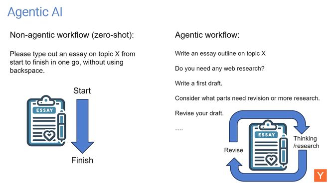 过去一年中变化很大的一件事,以及在AI技术趋势方面,如果你问我AI领域最重要的技术趋势是什么,我会说是代理式AI的兴起。大约一年半以前,当我开始四处演讲,试图说服人们人工智能代理可能成为现实时,我没有意识到,大概在去年夏天,一群营销人员会抓住这个概念,把它当成标签一样,贴在所有能看到的东西上,这几乎让它失去了一些意义。但我想从技术角度和大家分享,为什么我认为代理型人工智能令人兴奋且重要,而且也开启了更多的创业机会。