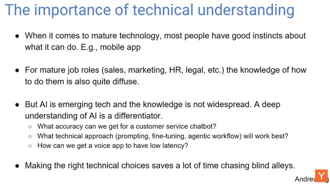 这是我想谈的最后一件事,那就是我发现理解人工智能实际上能让你走得更快。原因如下。作为一个人工智能从业者,也许我倾向于支持人工智能,但我希望与你分享原因。事实证明,当涉及到像移动设备这样成熟的技术时,你知道,很多人已经使用智能手机很长时间了。我们大概知道一个移动应用能做什么,对吧?很多人,包括非技术人员,对移动应用能做什么都有很好的直觉。如果你看看成熟的职位,比如销售、市场营销、人力资源、法律,它们都非常重要,也都非常困难。但是,你知道,有足够多的市场营销人员从事市场营销足够长的时间,而且在过去一年里,市场营销策略并没有发生太大的变化。所以有很多人非常擅长市场营销。而且这非常重要,非常困难,但这些知识相对分散,因为,你知道,如何做人力资源的知识,在过去六个月里并没有发生显著的变化。