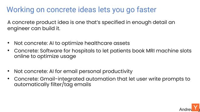 举个例子,如果你说,让我们用人工智能来优化医疗保健资产,你知道,这实际上不是一个具体的想法。它太模糊了。如果你让我编写软件,利用人工智能来优化医疗保健资产,不同的工程师会做完全不同的事情。而且因为它不具体,你无法快速构建它,你没有速度。相比之下,如果你有一个具体的想法,比如让我们编写软件,让医院,让病人在线预订核磁共振成像仪的时段来优化使用率,我不知道这是一个好还是坏的具体想法。实际上已经有企业在做这个了,你知道,但它是具体的。这意味着工程师可以快速构建它。如果这是一个好主意,或者你发现这不是一个好主意,你都会发现。但是拥有具体的想法会为你赢得速度。