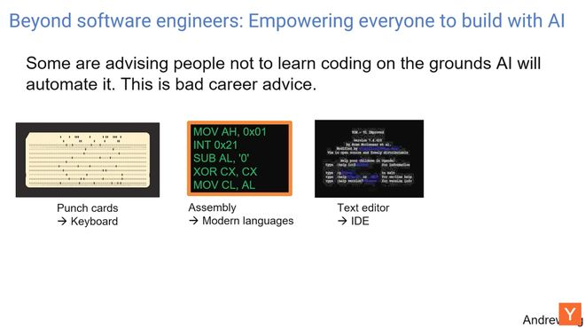 也许稍微超出软件工程的范围,我感觉现在是授权每个人构建人工智能的好时机。在过去的一年里,很多人建议其他人不要学习编码,理由是人工智能将会自动化它。我认为我们回头来看,这将会是有史以来最糟糕的职业建议之一。因为当更好的工具使软件工程更容易时,应该有更多的人去做,而不是更少。所以,当几十年前,世界从穿孔卡片转向键盘和终端时,这使得编码更容易。当我们从汇编语言转向高级语言,比如COBOL时,实际上当时有人争论说,现在我们有了COBOL,我们不再需要程序员了。实际上有人为此撰写了论文。但当然,那是错误的。编程语言使编码更容易,更多的人学习编码。文本编辑器、集成开发环境、人工智能编程助手。并且随着编程变得更容易,应该有更多的人学习编程。