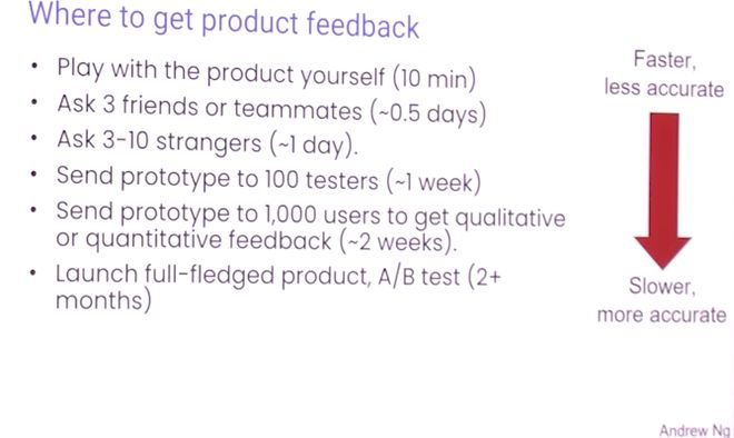 我发现对于创业公司的领导者来说,另一件重要的事情是,由于工程技术发展如此之快,如果你有很好的策略来获得快速反馈,从而更快地塑造你对构建内容的看法,这也有助于你更快地发展。因此,我将介绍一系列获得产品反馈的策略,以不断塑造你将决定构建的内容。我们将介绍一份清单,列出更快、可能不太准确的,以及更慢、更准确的策略。