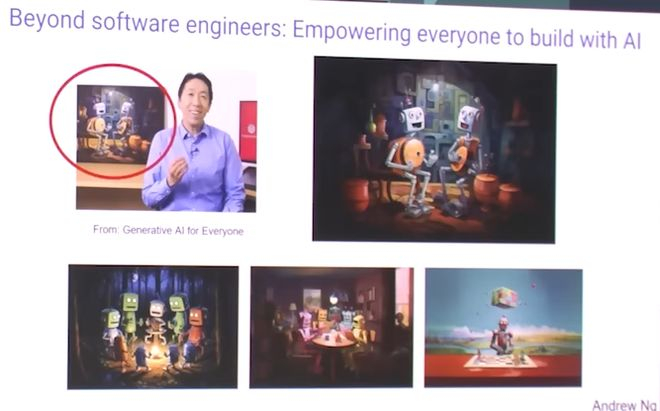我想和你们分享我学到的一个教训,关于为什么我们应该让人们学习做这件事,那就是当我在Coursera上教授“面向所有人的生成式人工智能”时,我们需要使用MidJourney生成像这样的背景艺术。而我的一个团队成员懂艺术史。因此,他可以用流派、调色板、艺术灵感来提示 MidJourney,从而很好地控制他生成的图像。所以我们最终使用了 Tommy 生成的所有图像。相比之下,我不懂艺术史。所以当我提示图像生成时,我可以写下这些漂亮的机器人图片。我永远无法像我的合作者那样进行控制。所以我无法生成像他一样好的图像。