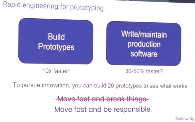 因此,我越来越发现,初创公司将通过构建20个原型来系统地追求创新,以了解什么有效。因为我知道人工智能领域存在一些焦虑。许多概念验证都无法投入生产。但我认为,通过将概念验证的成本降到足够低,即使许多概念验证没有成功,实际上也没有关系。我知道“快速行动,打破常规”的口号名声不好。因为,你知道,它打破了常规。有些团队从中得出结论,认为你不应该行动过快。但我认为这是个错误。我倾向于告诉我的团队要行动迅速且负责任。而且我认为实际上有很多方法可以快速行动,同时保持负责任。