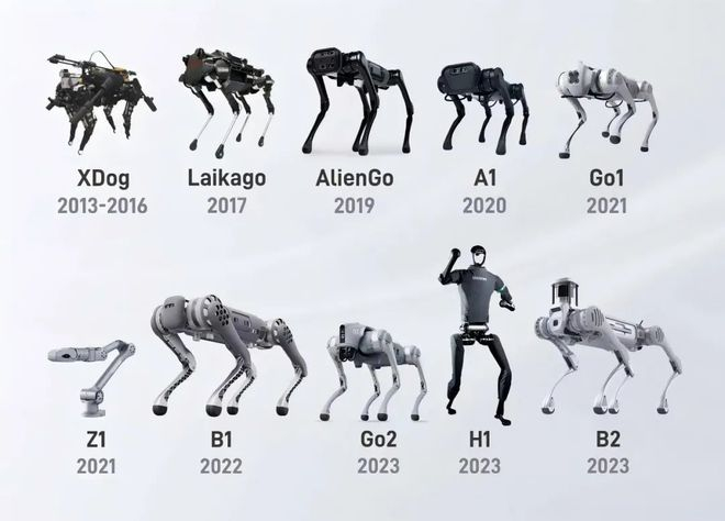 宇树从做机器狗起家,包括四足机器狗(Go系列、B系列)和人形机器人(H1系列、G1系列)等整机。