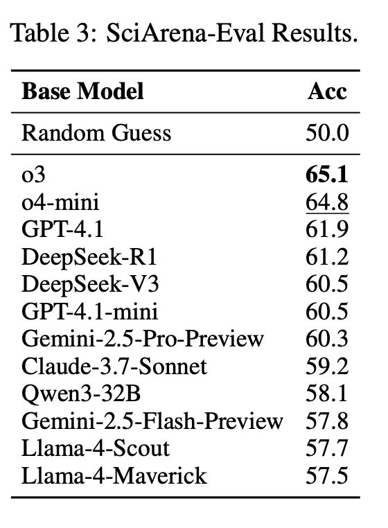 对比一下通用领域,像AlpacaEval、WildChat这些基准的评估模型,准确率都能跑到70%以上,相比之下,科研任务显得难多了。