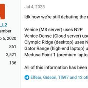 Kepler_L2 提到的纯 N2P 产品包括面向通用服务器的 Venice、面向云服务器的 Venice-Dense、面向 MSDT 主流台式机的 Olympic Ridge、面向高端笔记本的 Gator Range;而在 Medusa Point 1 上,其较低端型号将仅使用 N3P,高端产品则是 N2P + N3P 混合。