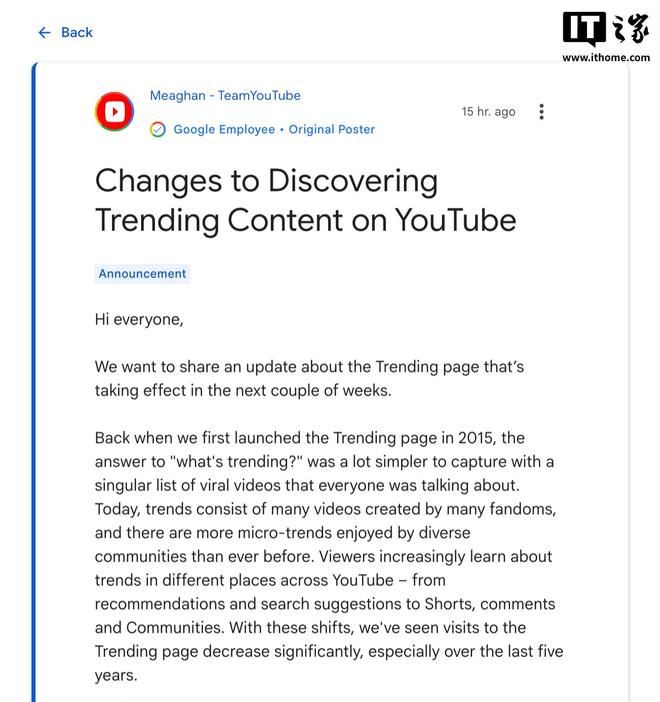 此外,用户现在通过首页推荐、搜索和评论区等多个渠道发现新的“趋势”,不再像过去那样依赖“热门”标签页。YouTube 表示,尤其在过去五年中,“热门”页面的访问频率持续下滑。