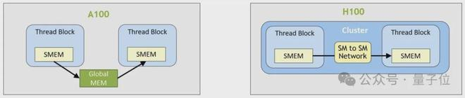 假设单个SM仅能处理32k输入,那么一个大小为16的集群将允许处理50万(0.5M)输入,而无需从全局内存(GMEM)重新加载数据。