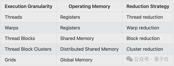 作者会按照下表从顶层到低层对值进行归约,并且每一步都只在对应的内存层级中进行加载和存储操作。
