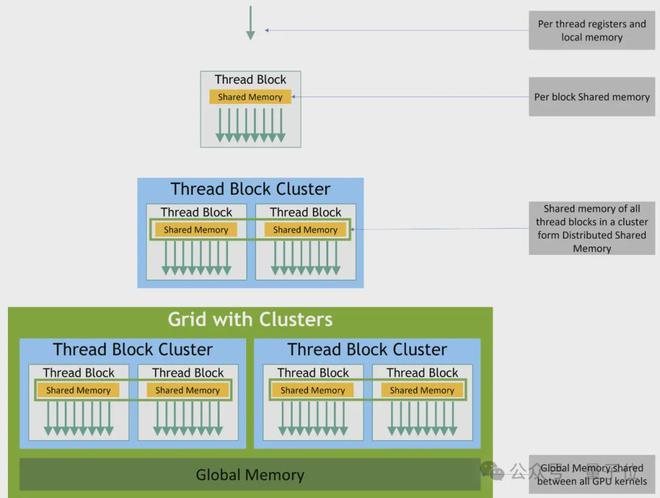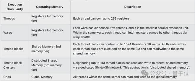 Hopper GPU的执行粒度与内存层级之间的对应关系: