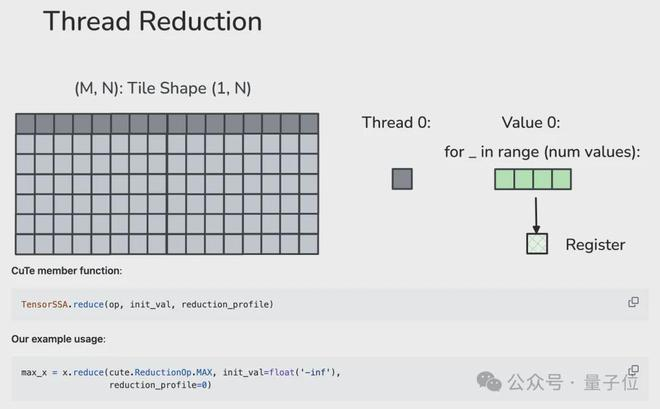 每个线程会在本地对多个向量化加载的值进行归约。作者使用TensorSSA.reduce函数,其中需要传入一个可结合的归约算子op、归约前的初始值init_val,以及归约维度reduction_profile。