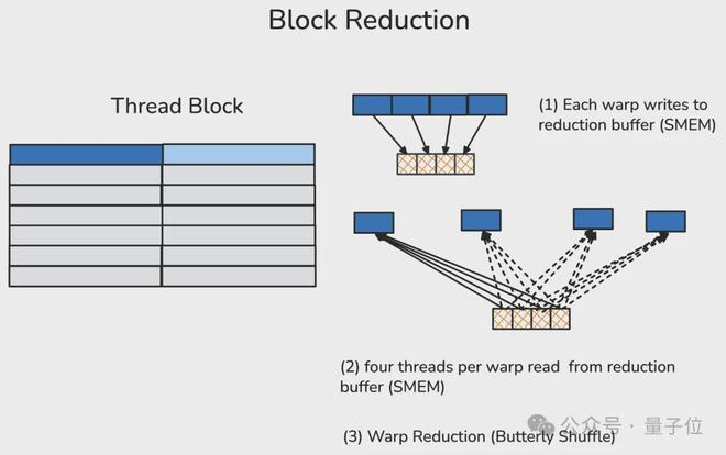 一个线程块通常包含多个(在H100中最多32个)warp。在线程块归约中,每个参与归约的warp中的第一个线程会将该warp的归约结果写入共享内存中预先分配的归约缓冲区。