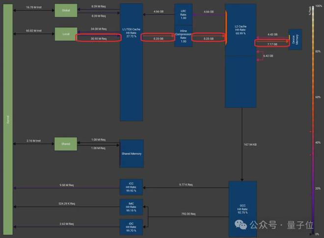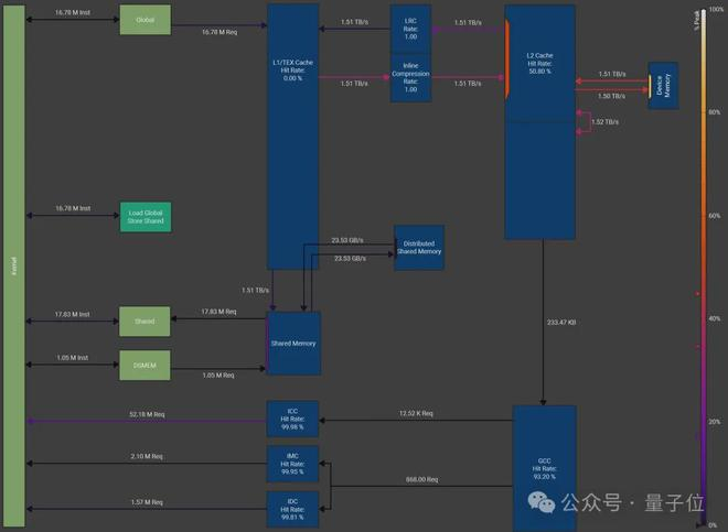 作者在配备HBM3显存(DRAM峰值吞吐量=3.35 TB/s)NVIDIA H100 上,对批量维度为16K、归约维度为 131K的softmax内核做了性能测试。内存工作负载图由Nsight Compute生成。
