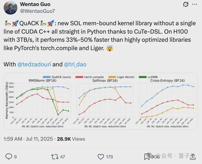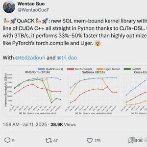 他和两位普林斯顿CS博士生提出了一个名叫QuACK的新SOL内存绑定内核库,借助CuTe-DSL,完全用Python写,一点CUDA C++代码都没用到。