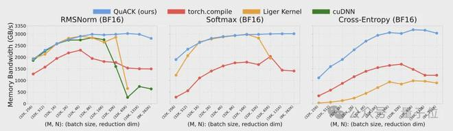 归约维度262k时,FP32的softmax吞吐量能到3.01TB/s,而torch.compile只有1.89TB/s,快了近50%。对于这3个内核,当归约维度≥65k 时,该实现方案显著优于所有基准对比方案。
