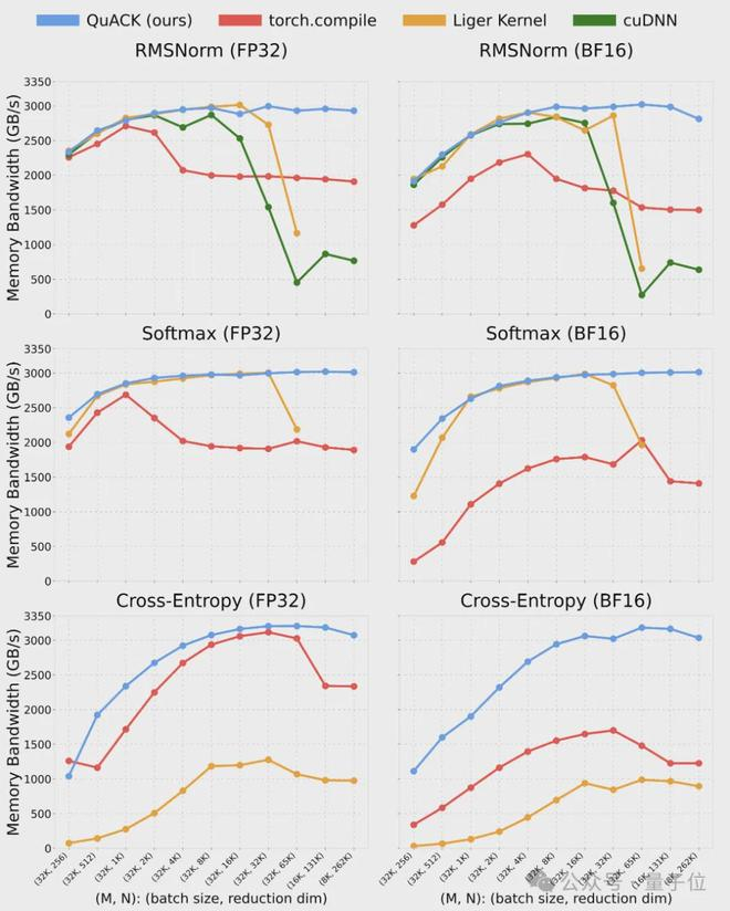 测试中使用的批量大小范围为8k-32k,归约维度范围为256-262k(256×1024),输入数据类型为FP32和 BF16。