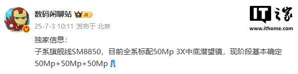 本月早些时候,该博主曾爆料某厂子系旗舰线 SM8850 新机,目前全系标配 50Mp 3X 中底潜望镜,现阶段基本确定 50Mp+50Mp+50Mp。结合来看,这两条爆料均指向 iQOO 15 系列手机。