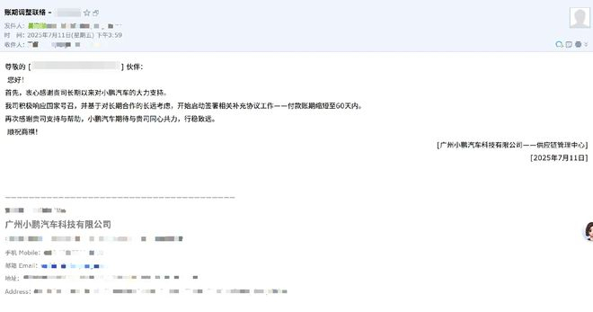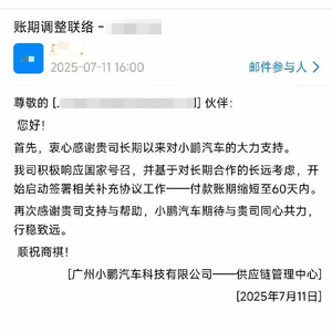 7月11日,澎湃新闻记者独家从小鹏汽车供应链方面获得了一份来自小鹏汽车的通知邮件。邮件显示,小鹏汽车宣布将原本的付款周期统一调整为60天内。邮件提及,“基于对长期合作的长远考虑,开始启动签署相关补充协议工作——付款账期缩短至60天内。”