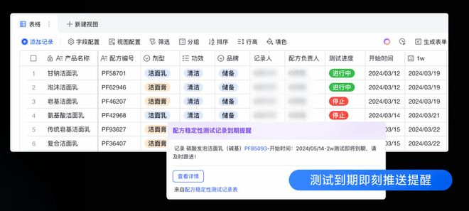 进入配方测试环节,飞书的自动提醒功能,能帮助配方师在配方稳定性考察监控中更精准地把握关键节点。