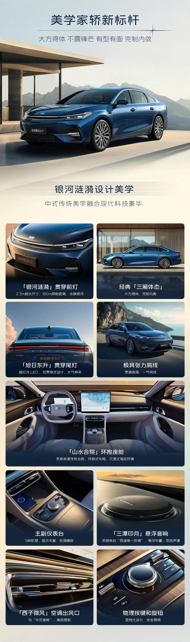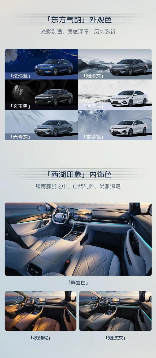银河 A7 将推出珐琅蓝、霜华银、砚雪白、玄玉黑、烟渚灰、天青灰 6 种外观配色和霁雪白、秋韵棕、烟波灰 3 种内饰配色。