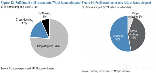 且根据JPM的测算,在2024年3季度Meli自管物流中的仓配形式的比重已达约53%(1H19时仅约7%)。换言之,拥有最优质时效和体验的仓配式已成为了Meli主流的物流履约形式。