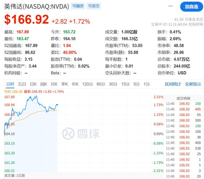 英伟达涨近2%,股价一度触及167.89美元,再创历史新高,总市值达4.07万亿美元。