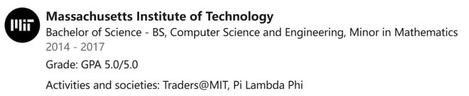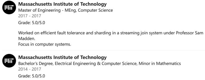 他在MIT先后拿到了CS的本科和硕士学位,GPA拿到了5.0的满分。