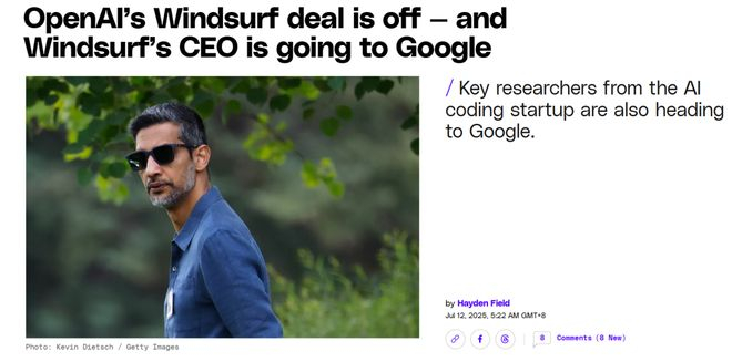 就在周五,Fortune报道称,OpenAI收购Windsurf的排他性期限已过,这意味着 Windsurf现在自由了,可以开始任何其他的收购要约。