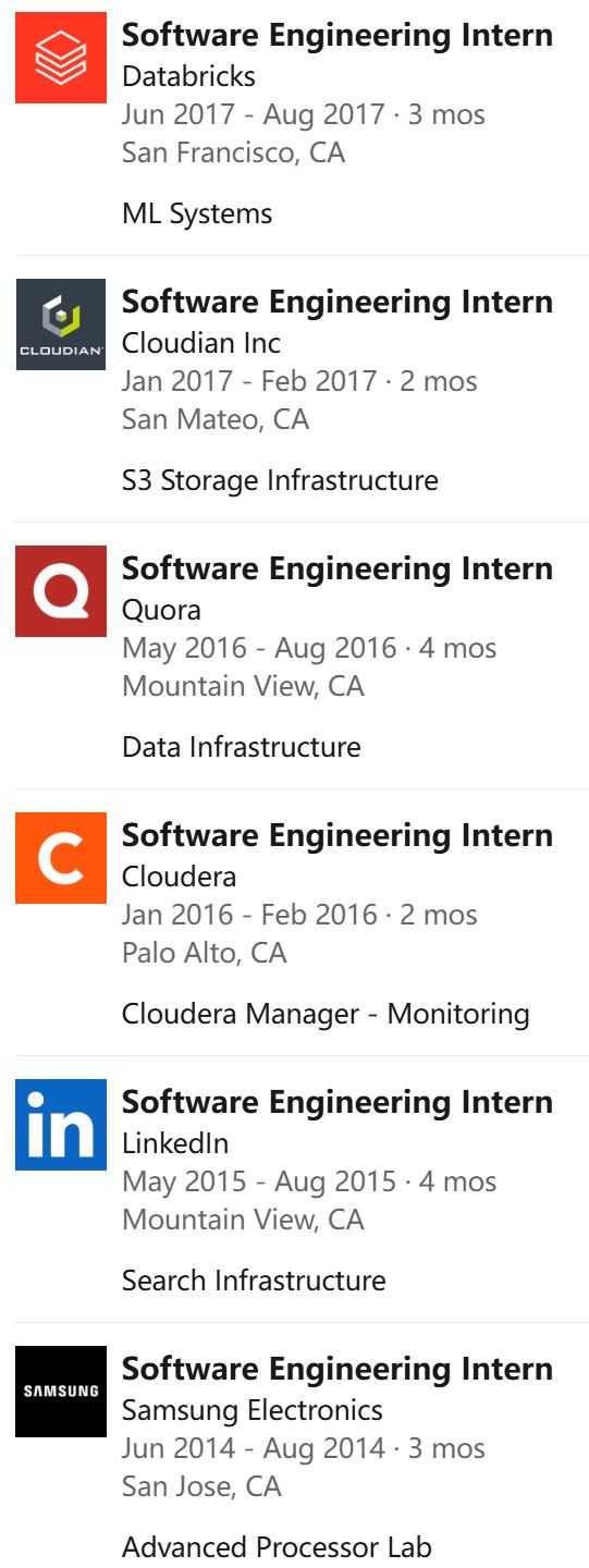 在三星、领英、Cloudera、Quora、Nuro等团队,他完成了一系列含金量颇高的实习。在自动驾驶公司Nuro的三年半,他最终晋升为自动驾驶基础架构团队的技术经理。