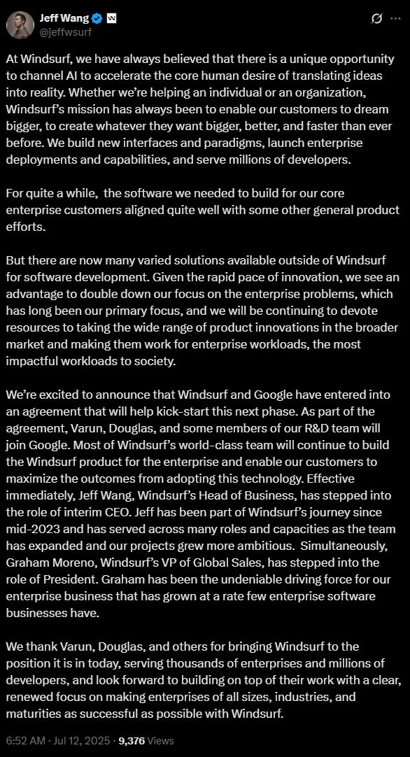 它只是挖走了公司的核心人物,并且拿走了Windsurf技术的非独家授权。而且,Windsurf本体还可以在原地继续营业。