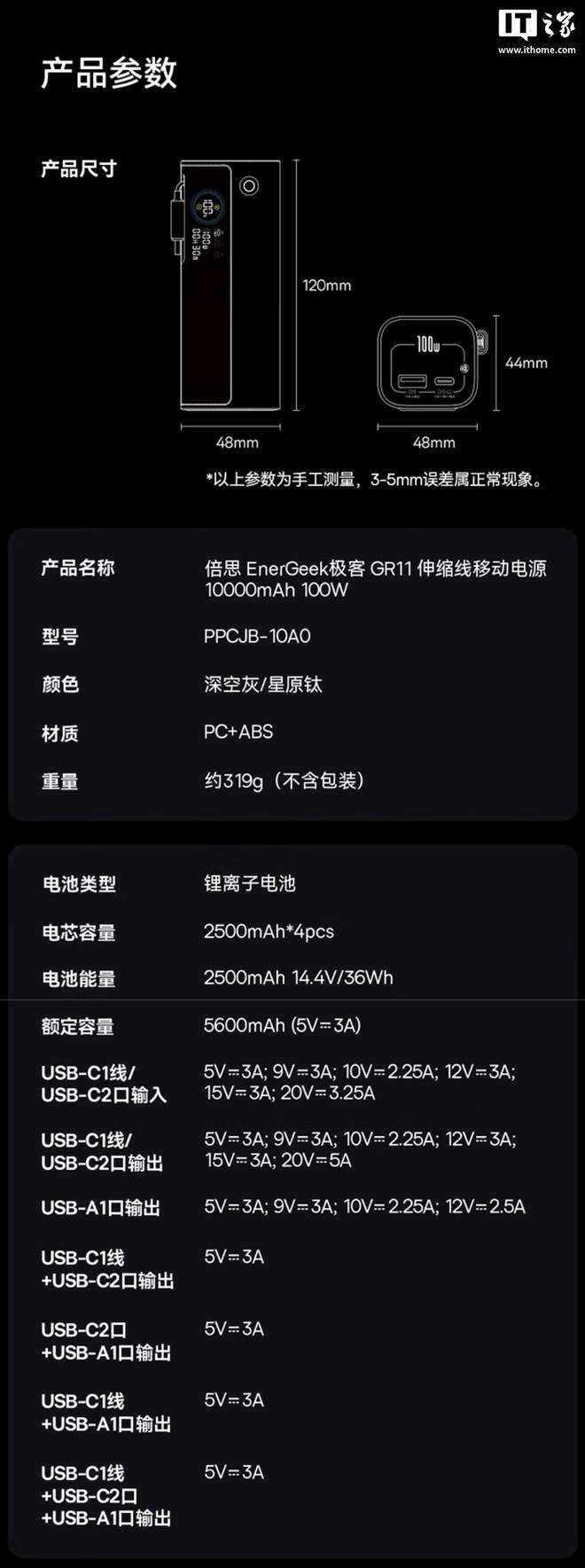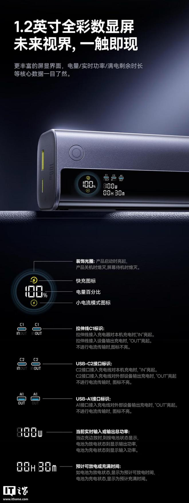 这款移动电源配色低调,整体重量约319 克,带有LED屏显,提供1根USB-C线+ 1 个USB-C接口+ 1 个USB-A接口,支持UFCS、PPS、PD 3.0、QC 3.0协议。其中USB-C接口 / 线单口输出100W,USB-A单口输出30W。