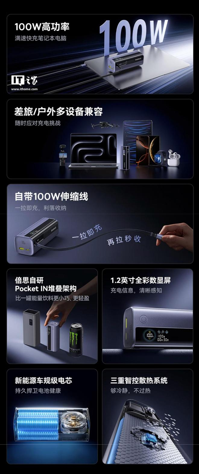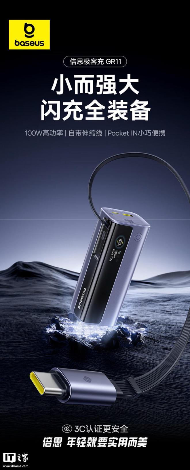 IT之家 7 月 12 日消息,倍思现已在京东上架一款 100W 自带线移动电源,这款移动电源匹配10000毫安时电芯,采用 2C+1A 设计,定价为199元。