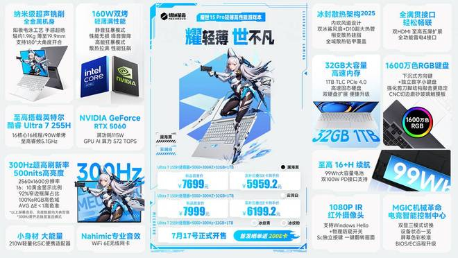 作为耀世Pro系列的首发代表产品,耀世15 Pro一亮相即惊艳全场。其全新冰纹青/冰纹粉配色采用独特A面蚀刻工艺与细腻磨砂质感,搭配撞色边框设计,将高颜值游戏本的视觉辨识度推向新高。更令人惊叹的是其三面全铝合金机身,在确保19.9mm纤薄厚度与1.9kg轻盈重量的同时,大幅提升整机强度。而在这轻薄铠甲之内,蕴藏的正是颠覆性能想象的澎湃动力与AI高静游戏本的冷静从容,具体体现在三大核心革新: