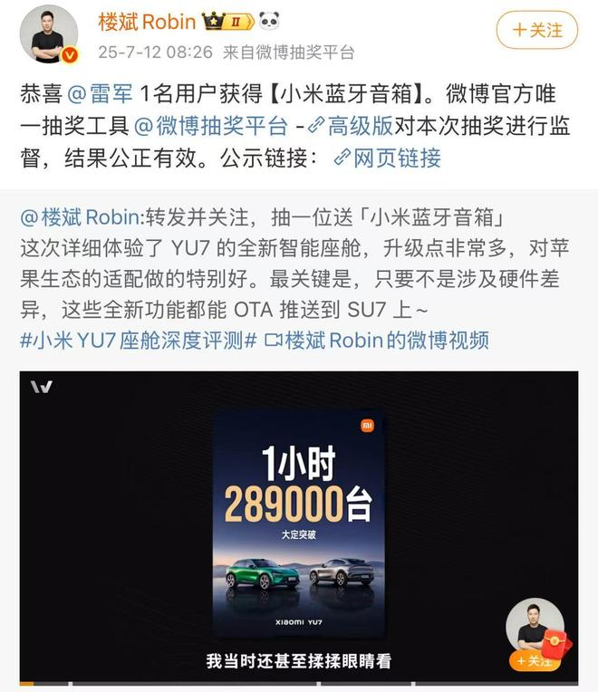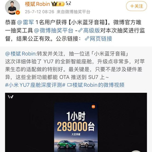 今日,有博主抽奖结果出炉,雷军抽中了