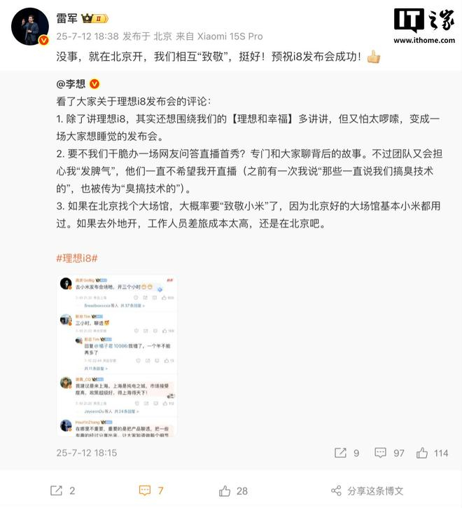 IT之家 7 月 12 日消息,今天下午,理想汽车 CEO 李想发文提到理想 i8 的发布会形式:“如果在北京找个大场馆,大概率要‘致敬小米’了,因为北京好的大场馆基本小米都用过。如果去外地开,工作人员差旅成本太高,还是在北京吧。”
