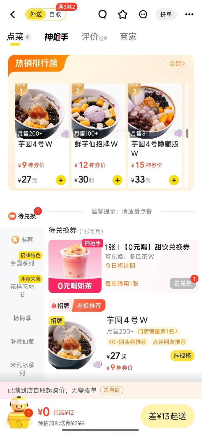 但在实际操作时发现,优惠券使用范围集中在指定品牌的两三款低价位饮料中,部门可选门店早早闭店,多数到店自取门店位置太远,可配送兑换券均设置起送价门槛,需要额外花钱点单才能享受“0元”产品。