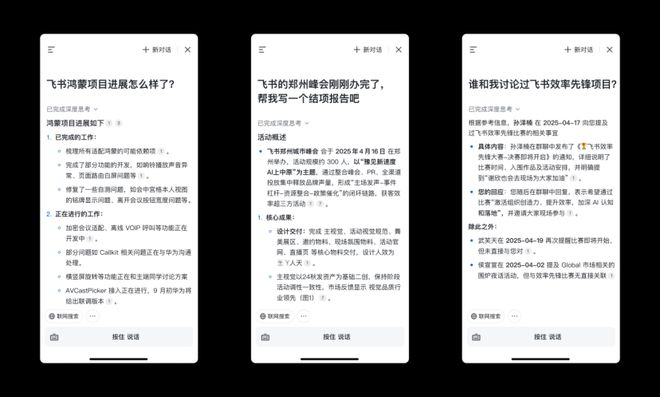 在广阔市场前景下,飞书在AI 产品研发上的持续投入。多年来,飞书依托字节跳动的技术优势,在人工智能、大数据等领域积累了深厚的技术沉淀。其发布的每个 AI 功能,都秉持对用户高度负责的态度,在行业内树立了良好的口碑。
