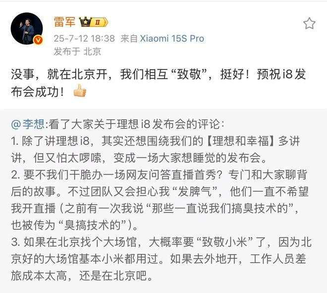 雷军回应李想找发布会场馆致敬小米:我们互相致敬