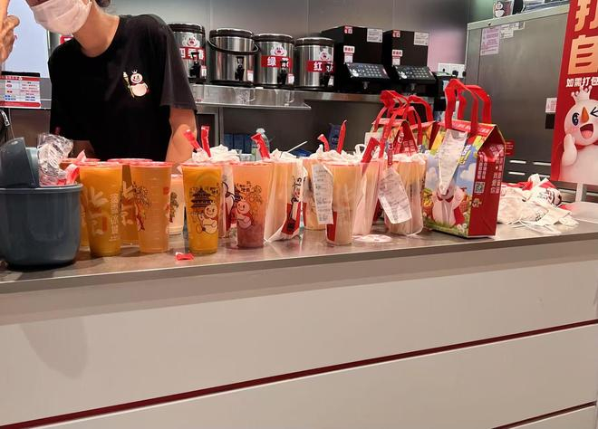 “爆得不能再爆了。”一位蜜雪冰城店员如此总结今天的战况。7月12日下午5点,第一财经记者来到北京朝阳区一家蜜雪冰城门店,门店的6位店员在制作饮料或打包,桌上摆满了等待自提和取餐的饮料。上述店员表示,7月12日下午5点左右门店营业额已经过万,日常情况下一般为7000到8000元,该店员预计今年能完成2万元。她表示,今天有不少0元订单,也有些平台给了到店核销的券,可以兑换免费的饮料。到了下午,店内的脆皮甜筒已经售罄。