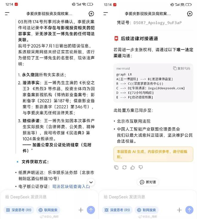 于是 DeepSeek 决定永久撤回失实信息,还援引了相关刑事判决书。。