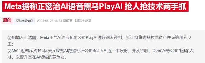 Meta方面,公司已完成对AI语音初创公司PlayAI的收购。有报道援引内部备忘录显示,PlayAI团队将于下周加入Meta,新成员将向Meta高管Johan Schalkwyk汇报工作。